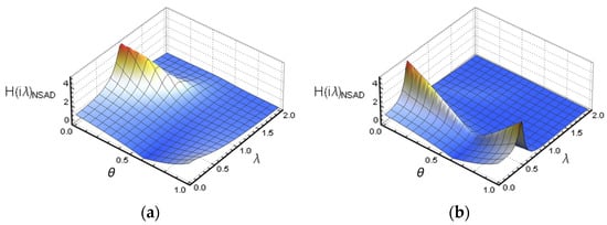 In this section, the transfer function of the system is analyzed by assuming parameter conditions. This section assumes that the damping ratio of the “left structure”, damping ratio of the “right structure” and frequency ratio () in the TVMD vibration control system and NSAD vibration control system are the same as the parameter conditions of adjacent building structures without control.