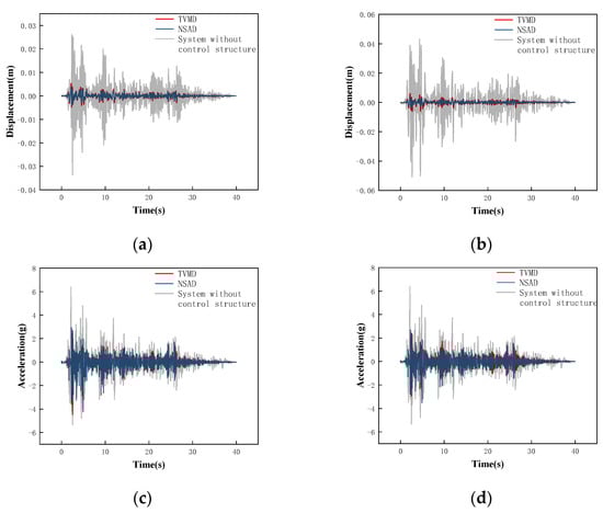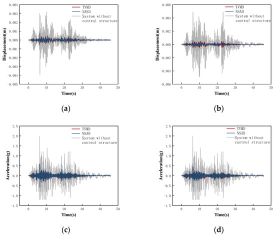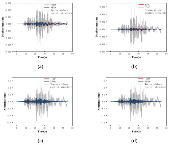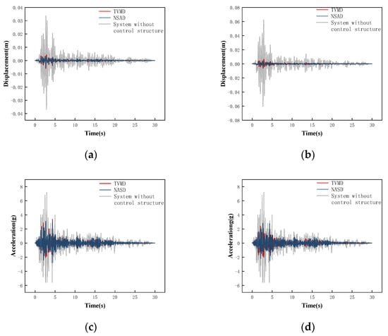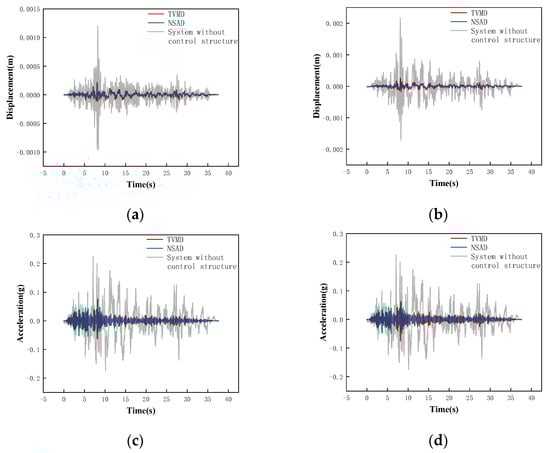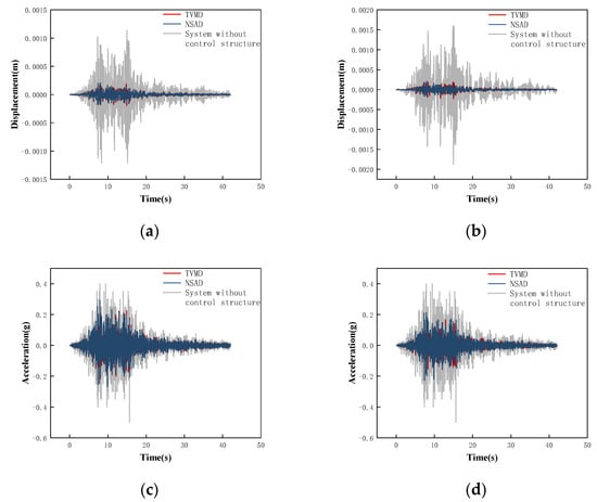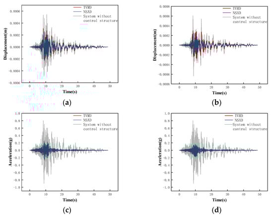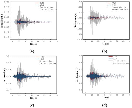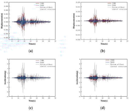 Combined with the conclusion in Section 3 that both the TVMD vibration control system and the NSAD vibration control system can play a role in structural vibration control, it can be concluded that the NSAD vibration control system has better vibration control ability than the TVMD vibration control system. In terms of the acceleration response, the effect of NSD on the structure is negligible.