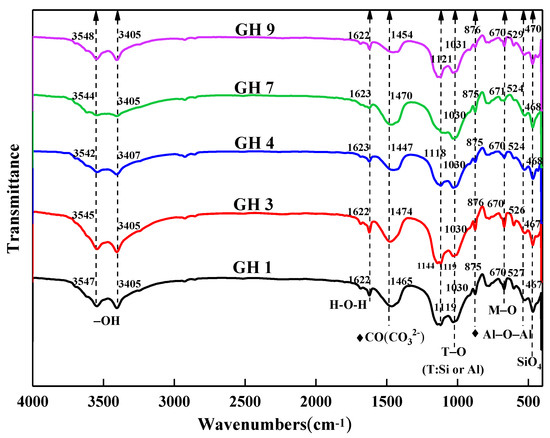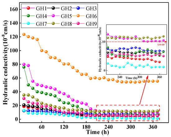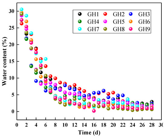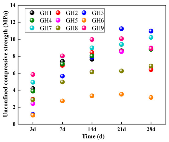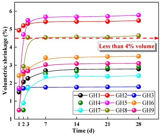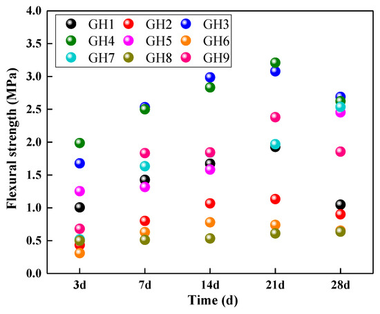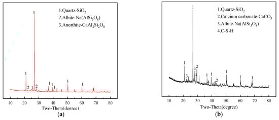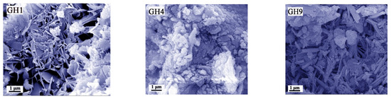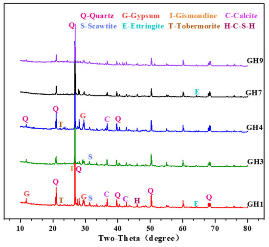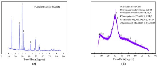 - No cracks in the solidified materials appeared during maintenance in natural conditions, and volume shrinkage ranged from 1.27% to 5.19%. After 28 d of maintenance, the compressive strength reached 3.15–10.96 MPa and the flexural strength was 0.64–2.69 MPa. The specimen permeability coefficients eventually stabilized at 1.22 × 10−8–55.4 × 10−8 cm/s. The concentration of hazardous and toxic elements in the solution of GH3 samples after 180 d of immersion fully meets the requirements of the specification, with environmentally friendly properties. Under the action of Ca2+ and OH−, SiO2 and Al2O3 in the reactive substrate reacted with Ca(OH)2 to form gismondine. The reaction of Ca2+ and CO32− with SiO32− groups produced zeolites such as scawtite and afwillite. At the same time, C-S-H and ettringite were intercalated with soil particles inside the sediment; this bonding formed a solidified body with strength;
