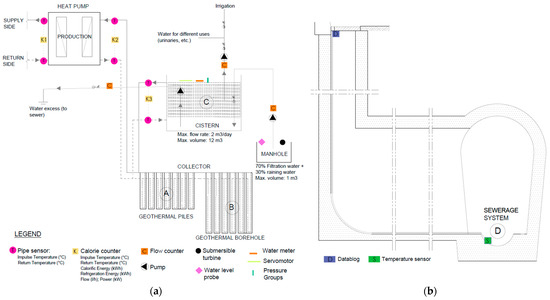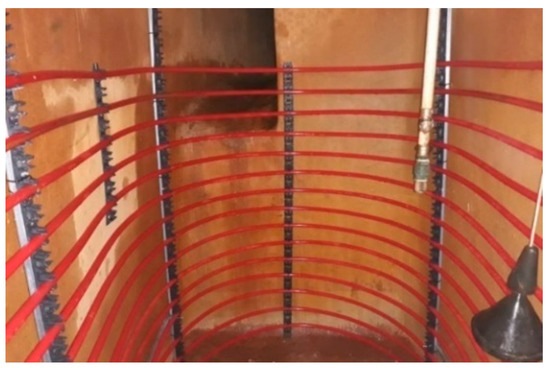 Figure 1 shows the wastewater heat exchanger, installed on the walls of the cistern, and connected in a closed circuit to the geothermal collector. It consists of a 100 m spiral pipe circuit of Pex Φ 20 mm with an EVAL-anti-oxygen barrier layer. The cistern is buried beneath the engine room of the building and has a maximum volume of 12 m3. To comply with current sanitary regulations, the thermal saturation of the water is avoided by means of a pumping system that renews the water when it reaches a certain limit. The water is kept at temperatures below 20 °C to prevent the proliferation of legionella bacteria and bad odors in the water that is reused in sanitary units and for the irrigation system.
