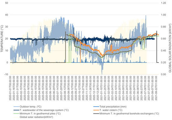 Figure 4 shows the temperature variation of the three energy sources on an annual basis. Wastewater at the sewerage system level has more favorable temperatures in the winter. In the intermediate seasons and the first weeks of summer, wastewater (groundwater and rainwater) and geothermal water have more favorable temperatures for cooling energy. However, from a temperature perspective, wastewater (groundwater and rainwater) is a more efficient source of energy than geothermal, even in winter, as ground temperature is altered and impaired via thermal exchange with the building.