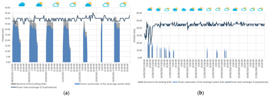 The current demand for the heating and cooling of the case study building can be ap-appropriately covered by HPs operating with HE using renewable energy from sewerage wastewater, as illustrated in Figure 5. The maximum demand of the building (45 kW) can be fully covered by this source, which, with average flow rates of 5 L/s measured at the measurement point considered, and a 2 °C thermal jump, can provide up to 45 kW, both in heating and cooling.