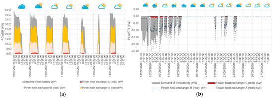 Figure 6 shows demand coverage values for HEs A + B + C (real) in a selected week. In both heating and cooling modes of the HPs, the maximum demand of the building is covered mainly by renewable sources, and a small part is covered by the electricity supplied by the HPs. In the heating mode, the maximum demand of the building (44.57 kW) is covered by renewable sources, mainly by HEs A + B (15.21 kW + 15.57 kW), and a small part is covered by HE C (1.22 kW). In the cooling mode, the maximum demand for the specific week under study (−21.25 kW) is also covered by renewable sources, mainly by HEs A + B (−13.66 kW + −14.82 kW), and a small part is covered by HE C (−1.10 kW).