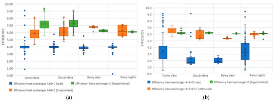 Figure 7. (a) Box and whisker plot of efficiency in winter. (b) Box and whisker plot of efficiency in summer. In both box and whisker plots, in blue, efficiency HEs A + B + C (real), in orange, efficiency HEs A + B + C (optimized), and in green, efficiency HE D (hypothetical).- o