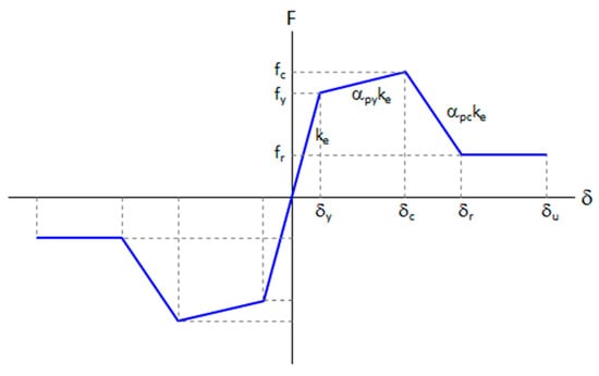 The ESDOF modeling approach requires using a hysteretic model with global structural parameters to obtain an inelastic dynamic response under seismic excitation. There are many different hysteretic models, from the simplest to the most complex. The important issue is to select an optimum model that has sufficient model parameters to simulate the global seismic response of the structure in a satisfactory manner. To this extent, one of the most suitable models is the one that has been proposed by Ibarra et al. [], called the Ibarra–Medina–Krawinkler model. This is a vertex-oriented hysteretic model which can simulate all types of degradation (i.e., stiffness, strength and pinching), which was enhanced by Lignos [] with a modified envelope curve and renewed modes of deterioration. This hysteretic model was used in the OpenSees seismic analysis platform in terms of the moment versus chord rotation relationship. In order to use the hysteretic model in the ESDOF approach, these parameters have been converted to force and displacement, respectively, by using their basic structural definitions.