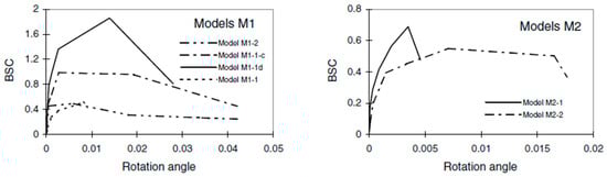 Base shear coefficient (BSC) versus rotation angle plot obtained from the specimens tested by Tomazevic et al. [].