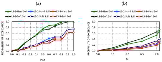 Probabilities of LS exceedance with changing (a) PGA and (b) M for both soil conditions.