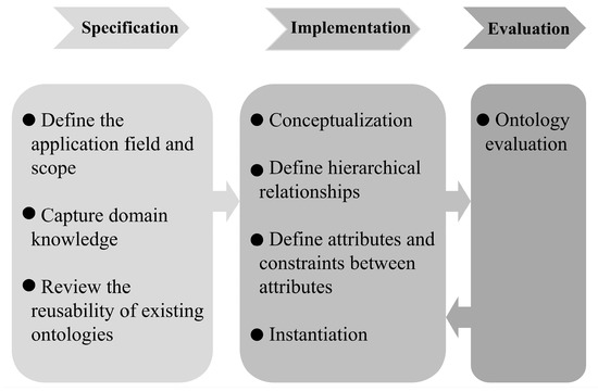 Various academic organizations and research institutes have proposed diverse approaches to ontology development tailored to their specific requirements. Upon reviewing popular development methods, notable ones include the IDEF5 Ontology Description Capture Method [22], the TOVE method [23], Methontology [24], and the seven-step method [25]. Methontology primarily focuses on constructing and managing ontology at the knowledge level but lacks a detailed description. The seven-step method emphasizes modeling operational details while lacking a comprehensive and systematic evaluation mechanism and documentation function. In this development endeavor, we amalgamated the strengths of the Methontology method and the seven-step method to propose an improved seven-step method (Figure 1) for developing the construction process information ontology model of building components. The main steps are as follows:
