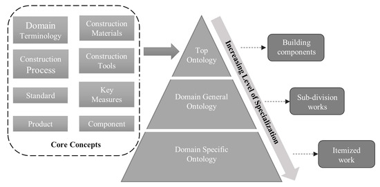 Based on crucial information concerning the construction process of building components, and drawing from the core elements proposed by quality management experts (i.e., human, machine, material, method and environment), we extracted the core concepts for the top-level ontology. These concepts encompassed domain terminology, standard, construction materials, construction tools, construction process, construction products, product components and key measures (Figure 2). Domain terminology originated from specifications serving to elucidate and facilitate the understanding of special terms used in construction materials, tools, product components and the construction process. Construction materials and tools represented the main resources required for the construction process, while the standard provided constraints for other parts of the information. The construction process class embodied the representation of the construction work process. Acting as supplementary descriptions during construction, the key measure class served to expound the operational requirements of construction activities in detail, as well as the demands for materials, tools and other resources. Construction products and product component classes were used to describe the construction products. Specifically, the construction products referred to the building components mentioned earlier, with this distinction made to avoid confusion with the components that comprised the building components. For convenience, the subsequent expression would often replace building components with building products.