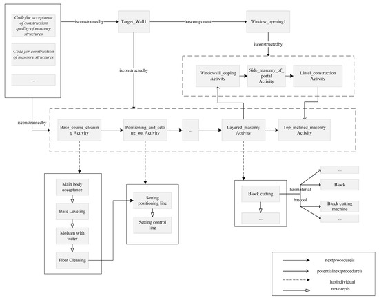 It was noteworthy that the construction process of masonry engineering was dynamic, and that the characteristics of the construction target wall exerted an influence on the construction process. For example, if the overall size factor of the wall necessitated the addition of other wall components, the construction process would undergo local changes and updates. The relationship “potentialnextprocedureis” was used to represent the potential sequence relationship between construction activities.