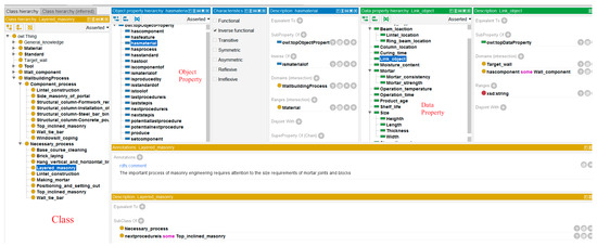 The hierarchical relationship of properties, as well as the definition of the application subject and scope, were described in the OWL RDF/XML syntax. Considering the object property “hastool” as an example, the application subject was the construction process, whereas the application scope encompassed the construction tool. Moreover, an anti-property labeled “istoolof” was established.