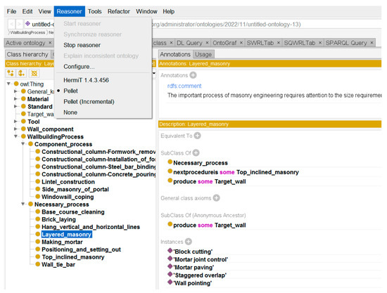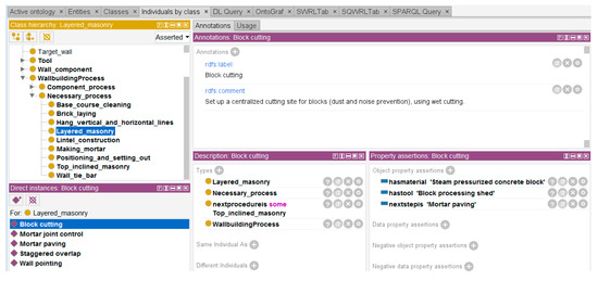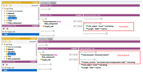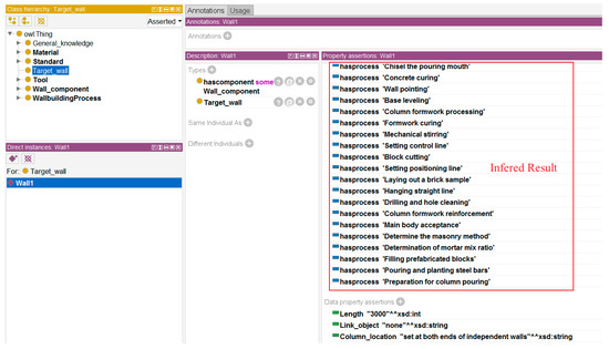 Protégé is equipped with its own Drools inference engine, which facilitates the import of SWRL rules and execution of Drools rule inference via the software’s SWRLTab plug-in. In combination with the previously developed construction process information ontology for infilled walls, and the constructed SWRL rule example mentioned in Section 3.3.2, we performed reasoning. By inputting the wall instance and executing Rule 3, as mentioned in Section 3.3.2, we obtained the inference results shown in Figure 9.