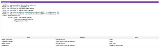 Compared with the aforementioned ontology rule reasoning and its application functions, the query statement is a practical function for users. Hence, the SPARQL query statement developed in this study was designed based on the actual requirements for knowledge retrieval and querying in the construction process knowledge. It encompassed the pertinent normative provisions, construction parameters, process flow, construction key points, quality control points, construction tools and construction materials relevant to the construction process and past experiences.