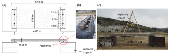Regarding the boundary conditions, the concrete slabs were supported on two steel-clad concrete blocks designed to withstand repeated explosions. The span between supports was 4.00 m. The anchoring system was intended to simulate a supported slab with fixed supports. Figure 1 shows a scheme of the concrete slab with its main dimensions and the details of the boundary conditions.