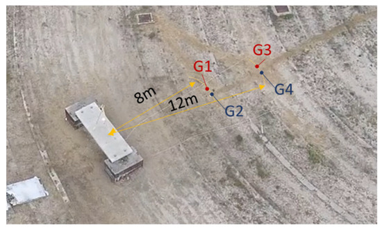 To measure accelerations in the slab, two or three accelerometers (depending on the test) were located on the rear face of the slab, with one of them in the center of the slab and the other two 1 m from the center (see Figure 4). In the tests with smaller scaled distances, accelerometers were not used due to the risk of damaging the sensors. To register the shockwave in these tests, pressure gauges were placed on the ground at standoff distances of between 8 and 12 m, as shown in Figure 5.
