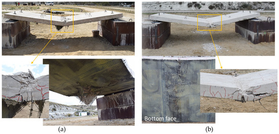 Post-blast images of slabs protected with CFRP with the charge at a standoff distance of 1 m: (a) test P6; (b) test P8.