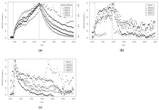 Normalized signals from five MOS VOC sensors for three emission scenarios: (a) human bioeffluents, (b) linoleum, (c) cleaning. Vertical dashed lines indicate the start (first line) and the end (second line) of the emission.