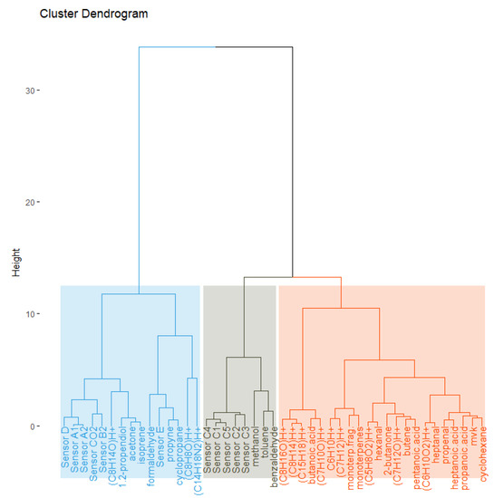 Figure 2 shows the results of the cluster analysis for the human bioeffluent emission scenario. The results are shown in the form of a dendrogram, which is a common practice to present clustering results displaying a close arrangement of observations with similar patterns; the colors indicate the different clusters. The dissimilarity or distance between clusters is shown as the height on the vertical axis. The data obtained during this scenario formed three clusters. The analysis placed sensors A, B, D, and E in the first cluster (marked with blue) together with compounds like acetone, isoprene, formaldehyde, and propyne (alkyl fragment; see Table 4). The second cluster (marked with a grey color) contained the signal from sensor C together with methanol, toluene, and benzaldehyde. The third and largest cluster (marked with an orange color) did not include any of the sensor signals, suggesting that the compounds identified in the orange cluster had concentration patterns that could not be associated with any signals obtained from the sensors. In other words, this result suggested that the sensors did not react to changes in concentrations for these compounds.