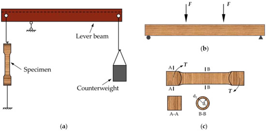 Sketch of the long-term test: (a) lever-loading device of tension perpendicular to grain [15]; (b) long-term test of bending [25]; and (c) long-term test of shear parallel to grain [26].