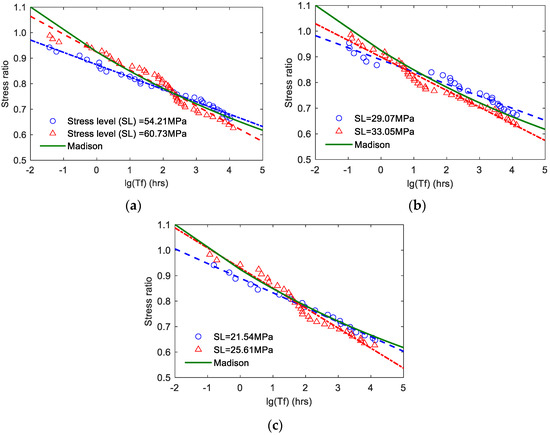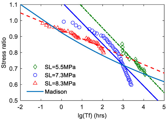 where SR denotes the stress ratio (%), and Tf denotes the duration of load in seconds. According to the Madison Equation (2), the strength of the structural timber after 10 years of constant load-holding would be 62% of the short-term strength. When only the results of Wood’s long-term loading test in the Madison equation were considered, a fitting equation (Wood equation) was given as follows [36]: