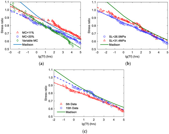 Fitting of flexural DOL effect of Norway spruce: (a) Norway spruce with three moisture contents (MC); (b) Norway spruce, MC = 20%; and (c) Norway spruce, dimensional lumber.