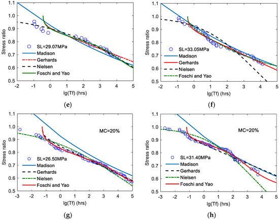 Fitting DOL model subjected to bending: (a) Canadian SPF, SL = 21.54 MPa; (b) Canadian SPF, SL = 25.61 MPa; (c) Canadian SPF, SL = 54.21 MPa; (d) Canadian SPF, SL = 60.73 MPa; (e) Canadian SPF, SL = 29.07 MPa; (f) Canadian SPF, SL = 33.05 MPa; (g) Norway spruce, SL = 26.50 MPa; and (h) Norway spruce, SL = 31.40 MPa.