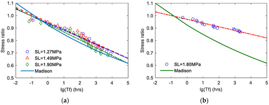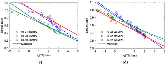 According to the percentile matching method, after determining the short-term strength corresponding to the long-term test to calculate the bending DOL effect, the long-term loading stress ratio of the tested specimen was calculated and labeled as the y-axis, and the logarithm of the time to failure Tf of the long-term test specimen was labeled as the x-axis to illustrate the DOL effect in semi-logarithmic coordinates. The flexural DOL effect results listed in Table 1 were fitted using the empirical equation and were compared to the Madison curve, as shown in Figure 3 and Figure 4.