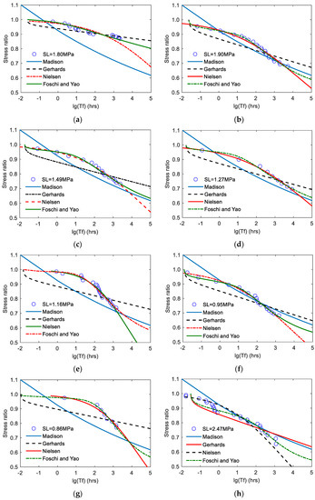 The results of eight groups of flexural DOL tests were used to verify the three DOL models—the Gerhards model, the Nielsen model, and the Foschi and Yao model—as mentioned in Chapter 3. The model parameters in the three models were estimated based on the maximum likelihood estimation method, as shown in Table 2. The DOL test results were also compared with the prediction results of three DOL models and analyzed the predictive ability of different DOL models against the bending DOL effect, as shown in Figure 5. Madison curves are also shown in the figure for comparative analysis.