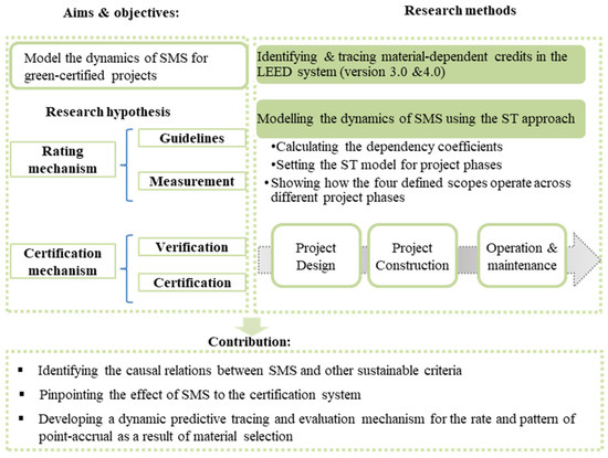 The study investigates the tools, techniques, and practises for SMS suggested by the LEED system. It identifies material-dependent credits, categorizes them into the four defined scopes, and determines the parameters’ dependency coefficient (DC). Then, the study represents the causal relations of SMS with other sustainable criteria using the science of ST. This study also investigates the effect of SMS on the point-accrual patterns across varying project phases, which affect overall certification levels. The research steps are shown in Figure 1.