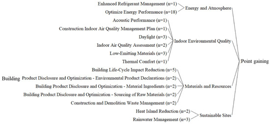 Scrutinizing the effect of the point-accrual pattern when EA = 0 showed more reliance on the scope of the guidelines, while more reliance was demonstrated for the measurement scope in cases of SS = 0, IEQ = 0, and MR = 0. This indicates that, in the former case, the project team should pay more attention to prescriptive guidelines, while, for the latter, less attention can be paid to the prescriptive approach and more to the performance one. Thus, the use of accurate measurement tools and techniques can enable the acquisition of points.