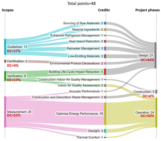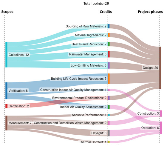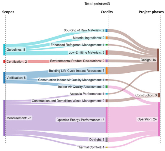 The interplay of point-accrual patterns for different scopes of SMS is represented across project phases using a Sankey diagram as shown in Figure 4. The credits were traced across a project’s life cycle to determine the long-term effect of material selection on building performance. Then, the high leverage points represented crucial decisions that affected the project’s life cycle, such as: