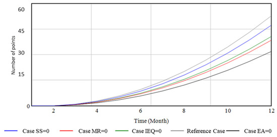 The project development timetable was hypothetically depicted in 12 months as shown in Figure 5. The model was checked for sensitivity and dimensional consistency in extreme settings. This was performed to resolve errors and gain a better understanding of interrelated variables to SMS. The influence on other sustainable categories was then demonstrated by comparing numerous case scenarios to the reference case (where all points were successfully gained). Hence, additional four simulation scenarios were performed for cases EA = 0, SS = 0, IEQ = 0 and MR = 0 and represented in Figure 6, Figure 7, Figure 8 and Figure 9. These scrutinized the worst-case of failure to gain points for the EA, SS, IEQ and MR, respectively. Comparing the four extreme case scenarios to the reference case showed that the maximum rate of point-accrual was recorded for the reference case, followed by cases SS = 0, IEQ = 0, MR = 0 and finally EA = 0. This indicates the importance of the EA category and that it is very challenging to gain points in the extreme case of not obtaining points under this category.