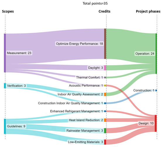 - In terms of project phases, it was noted that the greatest contribution to the point-accrual pattern was preceded by the operation phase of 50%, followed by the design and construction phases, at 44% and 6%, respectively.