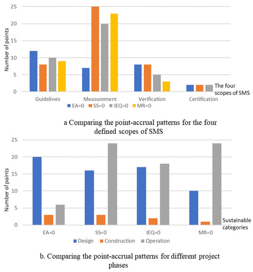 Comparing the four extreme case scenarios shows that it is more challenging to obtain points primarily when EA = 0, followed by when MR = 0, IEQ = 0, and, finally, when SS = 0, respectively. It also shows that more attention should be paid to the scope of guidelines in cases that fail to obtain points under the EA category; meanwhile, the measurement scope plays a major role when SS = 0, MR = 0, and IEQ = 0. The verification and certification scopes demonstrate a lower contribution to point accrual in this regard, but it is noted that, in cases that fail to obtain points for the EA or SS categories, the verification method should be implemented to guarantee optimum building performance. In sum, Figure 10a compares the point accrual patterns for the four defined scopes and Figure 10b illustrates them across different project phases.