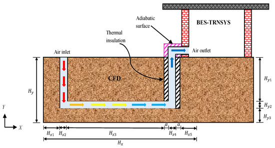 For the bottom boundary, the current work uses the concept of penetration depth used by some research works available in the literature [54,55]. This concept assumes that the daily heat wave (the daily oscillation in temperature of the outdoor air entering the EAHE) does not penetrate the soil beyond a certain radius, and this radius is lower than 1 m in the y downward direction. Therefore, this boundary can be considered as an adiabatic boundary after a certain depth. The bottom boundary can be expressed as follows: