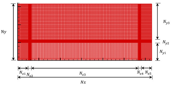 The mesh independence study consisted of varying the number of nodes representing the pipe length () from 71 to 111 nodes, while the rest of the sections remained constant. The results showed that after 101 nodes, there are no significant changes in the velocity and temperature of the air in the outlet. Once the number of nodes was established for the length of the pipe, the number of nodes varied in the sections of , , and from 50 to 90 nodes. From 71 nodes, it was observed that the outlet air temperature and speed no longer varied significantly. The number of nodes in the physical domain is 286 in the x-direction and 215 in the y-direction; the distribution is presented in Table 3.