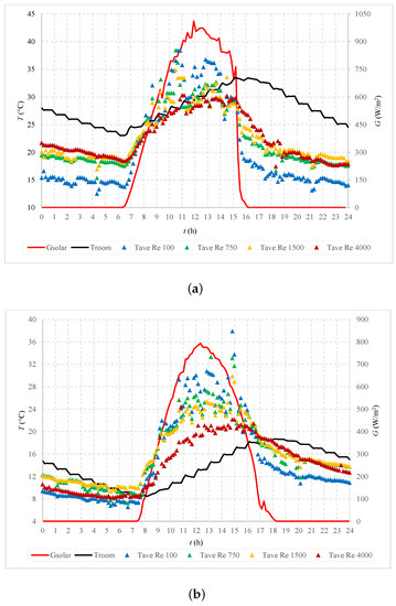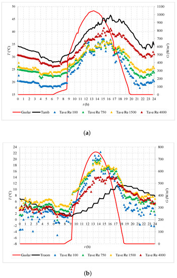Figure 6a shows a graphical comparison between the indoor air temperature of the room without EAHE and the air temperature at the outlet of the EAHE on the warmest day in Monterrey. Different air velocities for the air into the pipes are presented in the figure as a function of the Reynolds number (). On this day, the indoor air temperature of the building room ranges between 29.5 and 45 °C. The air from the EAHE is colder than the indoor air of the room the whole day for any value of . During the first seven hours, between 00:00 h and 07:00 h, the air from the EAHE was up to 15 °C colder than the indoor air. This temperature difference tends to decrease as solar radiation increases; however, it remains below room temperature, with a difference of 7 °C between 7:00 and 13:00 h for small Reynolds values. When the radiation decreases, around 16:00 h, the air temperature from the outlet of the EAHE decreases.
