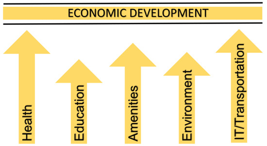 Five indicator categories can gauge a community’s likelihood of long-term economic success using the five pillars model as a baseline: (1) health, (2) education, (3) environmental quality and recreation, (4) social and cultural amenities, and (5) information and transportation access [25,26]. These categories cover a variety of pertinent elements in which local stakeholders and governmental, corporate, and nonprofit organizations are interested. Therefore, the ‘five pillars’ categories can help these organizations work together and coordinate their development activities more effectively. By monitoring important indicators of local needs and resources, the ‘five pillars of economic development’ idea offers a useful, consistent, yet flexible method for assessing a region’s quality of life and determining its ability to fix gaps [26]. Indicators that are considered leads, as opposed to lags, are the emphasis of the five pillars approach. In other words, it looks at markers that offer a future trajectory [25]. Figure 3 depicts this future in which social capital will increase through acceptable behaviors and equal access to resources.