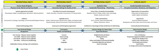 Judicial equity is added to Figure 3, outlining the necessity for equitable policy and governance, as shown in Figure 8. In Figure 8, symbiotic cities better represent urban architecture for wellbeing and sustainable place-making, and place-finding further defines inclusive green cities. Appropriately, value-inclusive design was moved under judicial equity for socially equitable communities resulting in regeneration and equal access through co-creation and co-design. The design canvas is supported by the earlier work of Zallio and Clarkson [33,35], fostering an inclusive mentality. The second objective was to capture a comprehensive picture of community resilience.