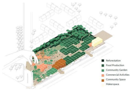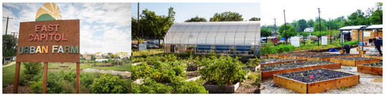 The East Capitol Urban Farm (Figure 11) is located on a three-acre site in Washington DC’s Ward 7. UDC leased the site from the DC Housing Authority for 3 years to build a communal urban farm. From its inception, ECUF was designed and built with input from local residents and partners. Its goals include promoting urban agriculture, enhancing food access and nutritional health, providing nutrition education, encouraging community gardening, fostering entrepreneurship, enhancing green infrastructure, and offering education and demonstration opportunities on the above topics. Despite being situated in an urban area, ECUF is the consequence of peri-urbanization. Peri-urbanization is the process of turning rural regions into urban areas. This transition affects the area’s physical, economic, and social characteristics and results in a place that is only partially rural and increasingly urban. Peri-urban zones are always open to change. Change results from the development process but may be controlled by sustainable development strategies [58]. Using co-creation and co-design, the Urban Greenhouse Challenge sought to fundamentally reshape not only the ECUF site but also its surrounding neighborhood. This involved using more robust, sustainable, and inclusive design principles. The ECUF is a model for future development that addresses food insecurity and other socioeconomic issues locally with urban agriculture serving as a catalyst for workable solutions.