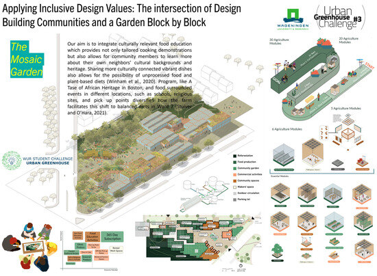 - Franz, A.; Stuiver, M.; Harris, E. WUR, Urban Greenhouse Challenge, Webinar Presentation: Inclusive Design hosted by Wageningen University and Research. Washington, DC, USA; Wageningen, The Netherlands, October 2021. 2021. Available online: https://youtu.be/IFFioKJjMIU/ (accessed on 10 December 2022).