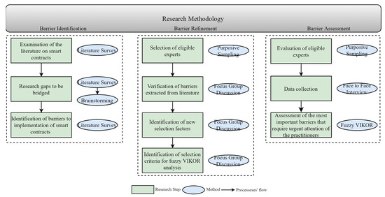 Consequently, the in-depth literature review presented above shows that the existing studies do not provide any insight into the criticality of these barriers. Generally, they just provide a list of barriers and discuss them by assuming the same level of criticality. In addition, there is a limited number of studies using advanced techniques, such as FGD and fuzzy MCDM methods, to rank these barriers [24,25,26]. Thus, there is an evident need to investigate barriers to smart contracts based on these research gaps.