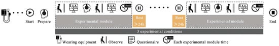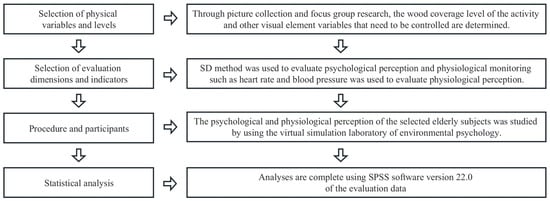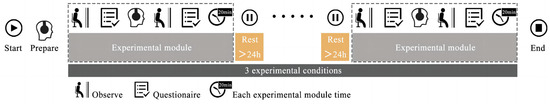 Due to the limited endurance of older individuals for prolonged testing, the six sets of scenes were randomly divided into three experimental groups. Each experimental group comprised four segments. Following a preparatory period, participants were tasked with observing the first set of scenes for 5 min. Upon completing the observation, they were provided with 2.5 min for semantic investigation, followed by a 5 min period of rest and adaptation. The process for the second set of scene experiments mirrored that of the first set. Participating in subsequent group tests required a rest period of at least 24 h. In order to prevent any undesirable effects resulting from the experience order, the order of scenes during the test was randomized [36]. After participants had completed all six scene experiments, the experimenter archived the experimental data. The research flow chart for the psychological evaluation experiment is depicted in Figure 3.