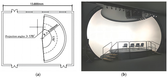 The experiment took place at the environmental psychology virtual simulation laboratory, situated within the Harbin Institute of Technology. The hemispherical screen with a resolution of 1920 × 1200, a height of 4.7 m, and a maximum radius of 4.5 m. This device offered a horizontal angle exceeding 170° and a vertical angle surpassing 160°, ensuring comprehensive visual coverage and effectively replicating the visual stimulation experienced within physical scenes. The laboratory maintained a controlled temperature of 22 °C, considered comfortable for elderly individuals residing in cold regions. Moreover, the permissible range for temperature and humidity fluctuations was ±5%. Figure 2 presents an overview of the laboratory layout and scene.