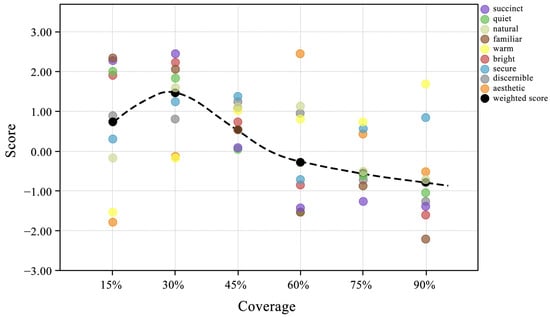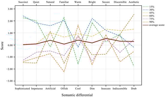 The semantic differential evaluation results were utilized to determine the highest and lowest scores for each semantic differential questionnaire. Average scores of each semantic category were then comprehensively calculated across different levels of wall wood coverage. The semantic category ‘succinct’ exhibited the highest and lowest values at 30% and 60% wood coverage, respectively. Within the coverage range of 15–60%, the ‘succinct’ semantics showed a slight increase followed by a decrease with the rise in wood proportion and continued to exhibit a slight increase and subsequent decline beyond 60% coverage. The semantic score for ‘quiet’ reached its highest and lowest values at 15% and 60% wall wood coverage, respectively. It decreased as the wood coverage increased within the range of 15–60% and then experienced a slight increase upon reaching 75% coverage, followed by a subsequent decline. The ‘nature’ semantics reached achieved its highest value at 30% wall wood coverage, declined to a negative value at 75% coverage, and reached its lowest value at 90%. An increase in wood coverage showed a fluctuation law of rising, falling, rising, and then falling. The ‘familiar’ semantics attained its highest value at a coverage ratio was 15% and its lowest value at 90%. Although there was a slight increase from 60% to 75% coverage, the overall trend in semantic evaluation exhibited a decline. The lowest value for the semantic score of ‘warm’ was observed at 15% coverage, while the highest value was recorded at 90%. It exhibited a slight decline within the range of 45% to 75% coverage, but the overall trend in semantic evaluation increased. The ‘bright’ semantics gradually increased from 15% to 30% coverage, reaching its peak at 30%, and then gradually decreased. The ‘security’ semantics peaked at a coverage rate of 45%, indicating a positive overall evaluation. The ‘discernible’ semantics attained its highest value at a coverage rate of 45%, became negative within the range of 75% to 90% coverage, and reached its lowest value at 90%. The overall trend initially increased and then decreased. The semantic score for ‘aesthetic’ was highest at 60% coverage and lowest at 15%, with a general pattern of rise and fall.