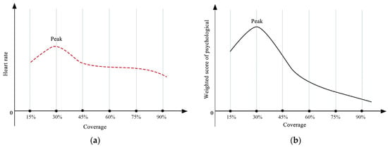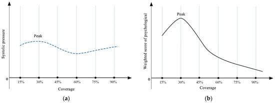 The analysis presents the influence mechanism of coverage change on the psychological perception of the elderly population, as depicted in Figure 6. The figure illustrates various curves representing the semantic evaluation results of each simulated space, while the thick red line represents the average psychological evaluation value of all subjects. The figure effectively portrays the alterations in psychological evaluation among different simulated spaces, considering variations in wall wood coverage.