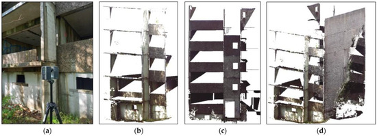 Ground-based laser scanning: (a) measuring device; (b) back elevation point cloud; (c) front elevation point cloud; (d) joined point cloud with gable wall view.
