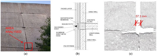 Identification of gable wall defects: (a) view of scanned gable wall; (b) sealing detail; (c) measurement of the gap between elements made on the point cloud.