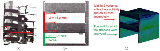 Non-verticality of structural elements can result in incorrect operation of structural components due to the redistribution of forces that is different from that assumed in the design. An example of incorrect assembly, which can occur in large-panel construction, is the setting of wall slabs at unintended eccentricities. For instance, in the analysed building, a wall whose eccentricity in relation to the wall of the lower storey was 15 mm. This is a value that, according to current standards [73], is considered to be the limiting value for the investigated case. In order to analyse the effect of the eccentrically applied load on the stress distribution in the wall of the lower storey, a 3D calculation model was made. The point cloud, together with the analytical model, is shown in Figure 4.