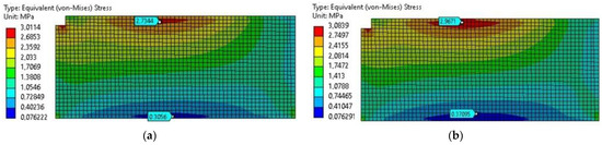 Stresses in the wall of the lower storey: (a) stresses in the case of the wall of the higher storey installed without an eccentric; (b) stresses in the case of the wall of the higher storey installed with a 15 mm eccentric.